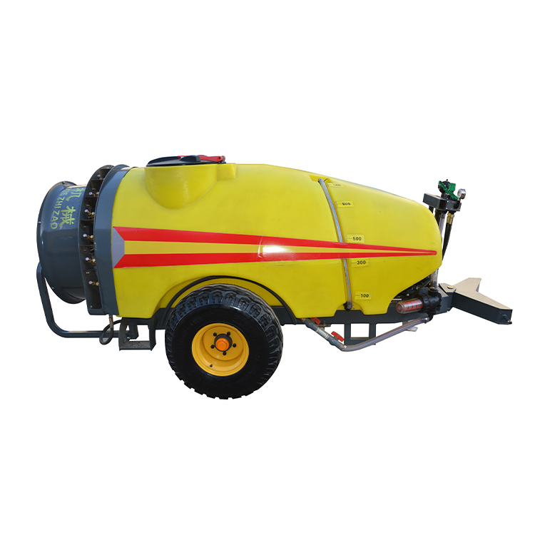 トラクター用ミストブロワー噴霧器は、緑色のフレームと黄色の大容量タンクを備えており、色のコントラストが印象的で、圃場での識別とメンテナンスが容易です。本装置の前部には、金属製の保護メッシュカバーが付いた大口径軸流ファンを搭載しており、強力な風を生み出す多翼設計となっています。後部は、上部に充填口、側面に観察窓やメンテナンスハッチを備えた長方形の黄色のPE材タンクで構成されています。中下部には高圧ポンプ、配管系、制御弁群、濾過装置などが一体化されており、配管のレイアウトがわかりやすくなっています。トラクターミストブロワースプレーユニット全体は、緑色にスプレーされた防錆フレームでサポートされており、下部に吊り下げ取り付けブラケットが付いており、トラクターの 3 点サスペンションシステムに直接取り付けて安全に取り付けることができます。